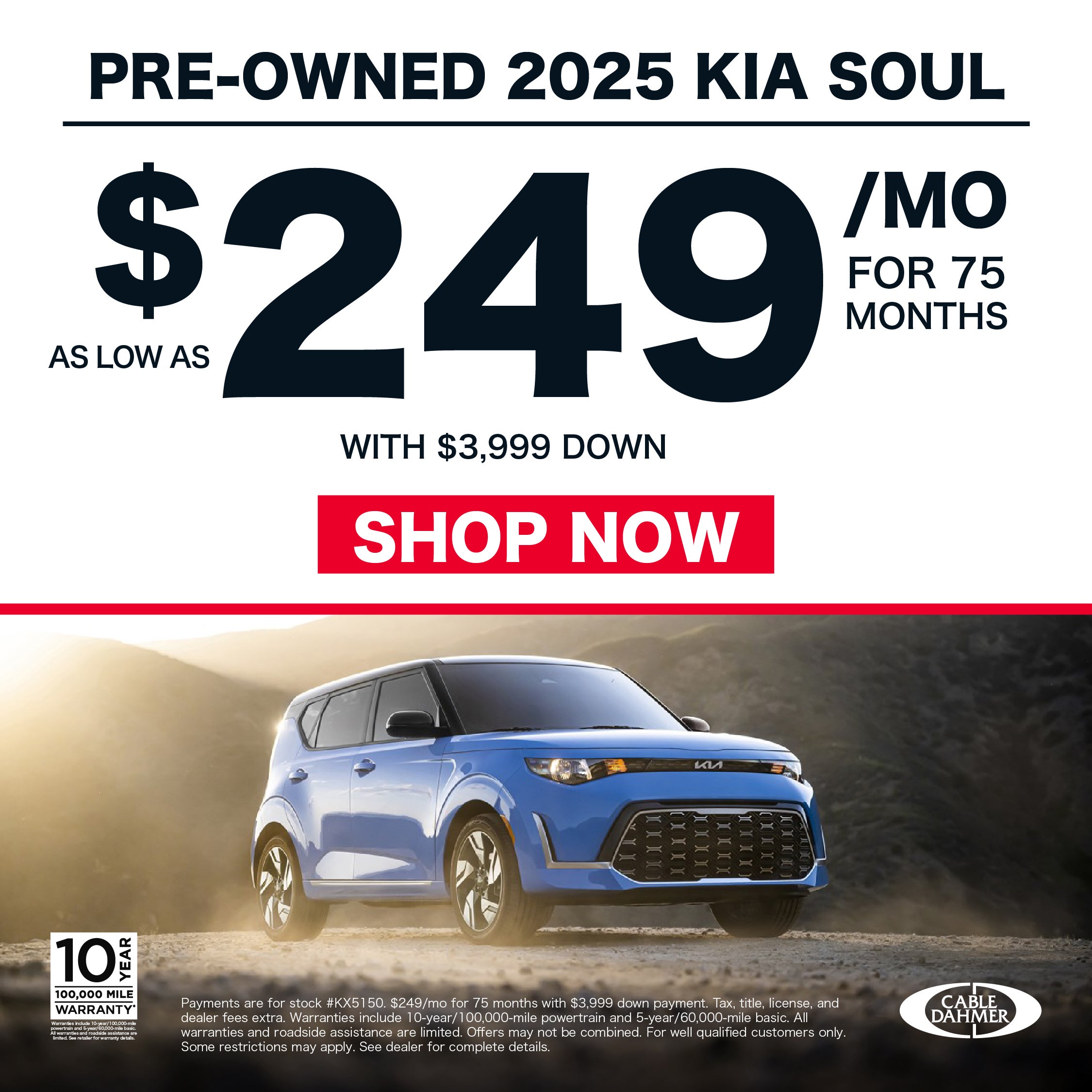 Payments are for stock #KX5150. $249/mo for 75 months with $3,999 down payment. Tax, title, license, and dealer fees extra. Warranties include 10-year/100,000-mile powertrain and 5-year/60,000-mile basic. All warranties and roadside assistance are limited. Offers may not be combined. For well qualified customers only. Some restrictions may apply. See dealer for complete details.