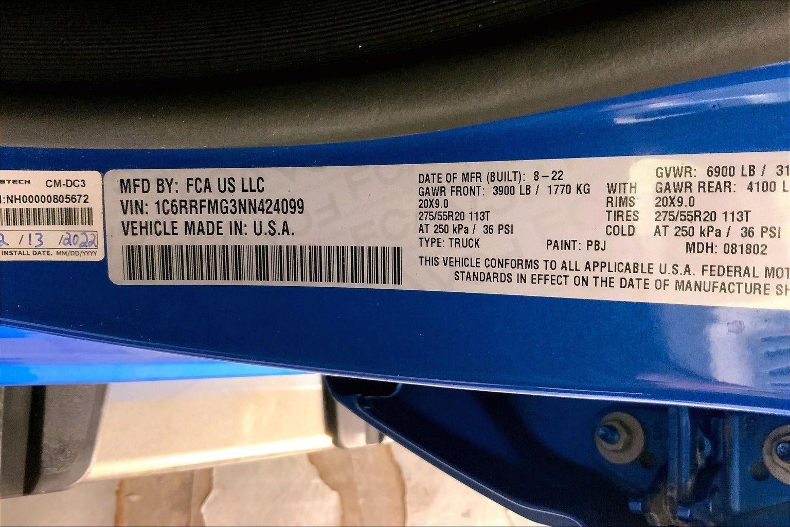 ENGINE: 3.6L V6 24V VVT ETORQUE UPG I, TRANSMISSION: 8-SPEED AUTOMATIC (850RE), QUICK ORDER PACKAGE 23Z BIG HORN, 3.21 REAR AXLE RATIO, WHEELS: 20"" X 9"" ALUMINUM CHROME CLAD, TIRES: 275/55R20 ALL SEASON LRR, HYDRO BLUE PEARLCOAT, DIESEL GRAY/BLACK, CLOTH BENCH SEAT, GVWR: 6,900 LBS, BIG HORN LEVEL 1 EQUIPMENT GROUP, FRONT LICENSE PLATE BRACKET, RADIO: UCONNECT 5 NAV W/8.4"" DISPLAY, CLUSTER 7.0"" TFT COLOR DISPLAY